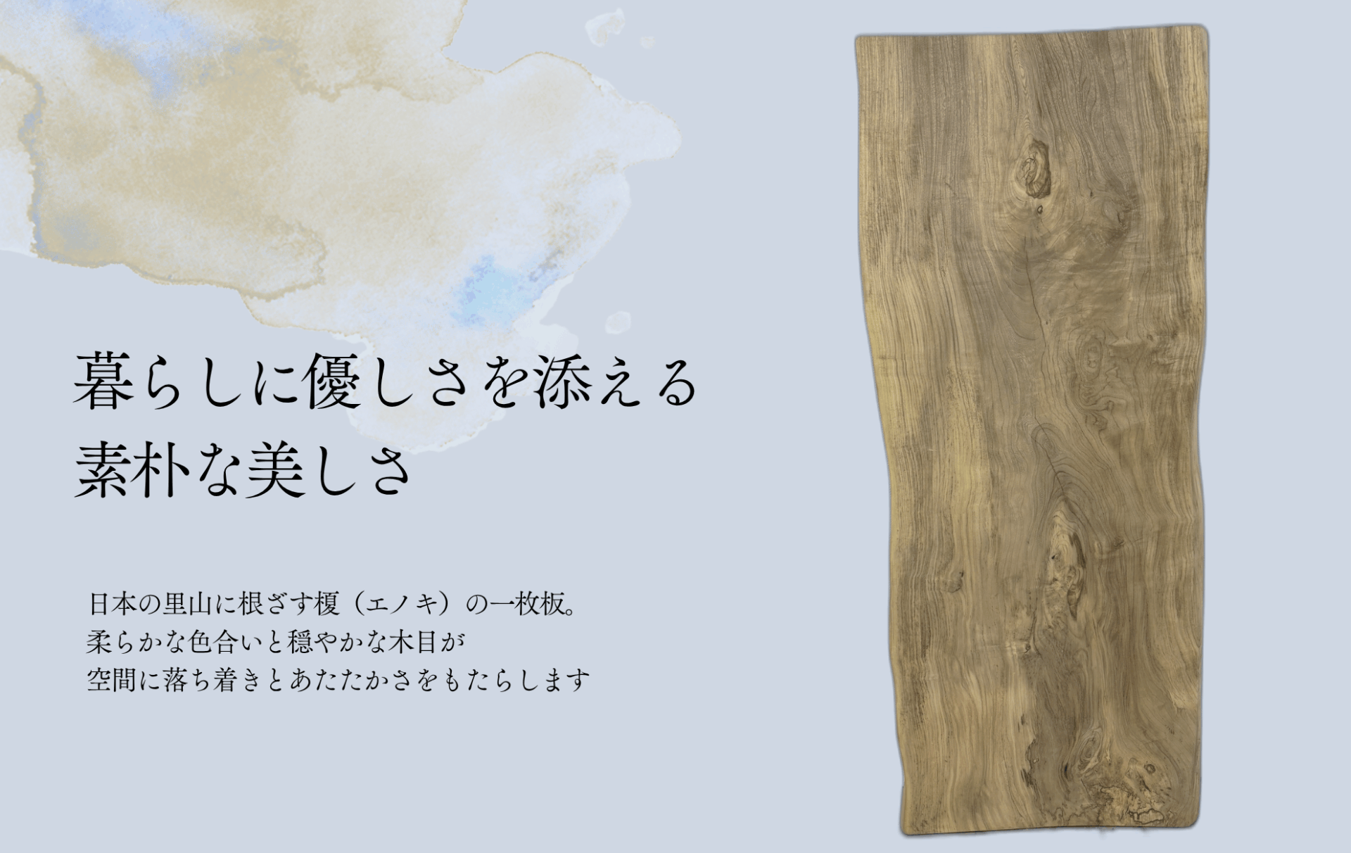 派手さはないけれど、見るたびにホッとする── エノキの一枚板には、そんな“素の美しさ”があります。 その控えめな木目とあたたかな色味は、使い手の暮らしに合わせて自然に溶け込み、静かに時を刻んでいきます。
