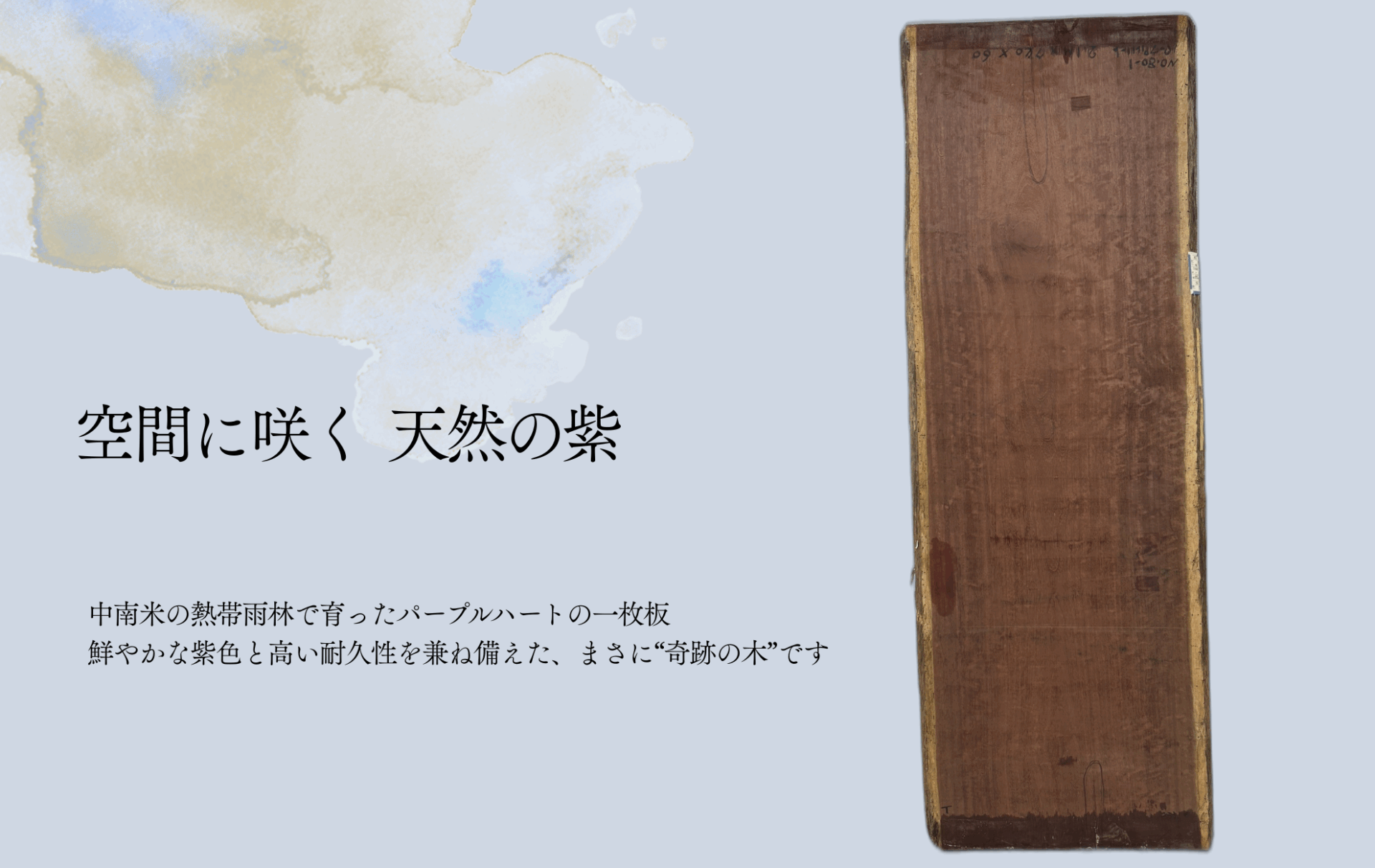パープルハートは成長が遅く、限られた地域でしか育たない希少木材。その珍しさと美しさから、使う人にも、見る人にも語りたくなるストーリーを届けてくれます。一枚板ならではの特別感をお楽しみください。